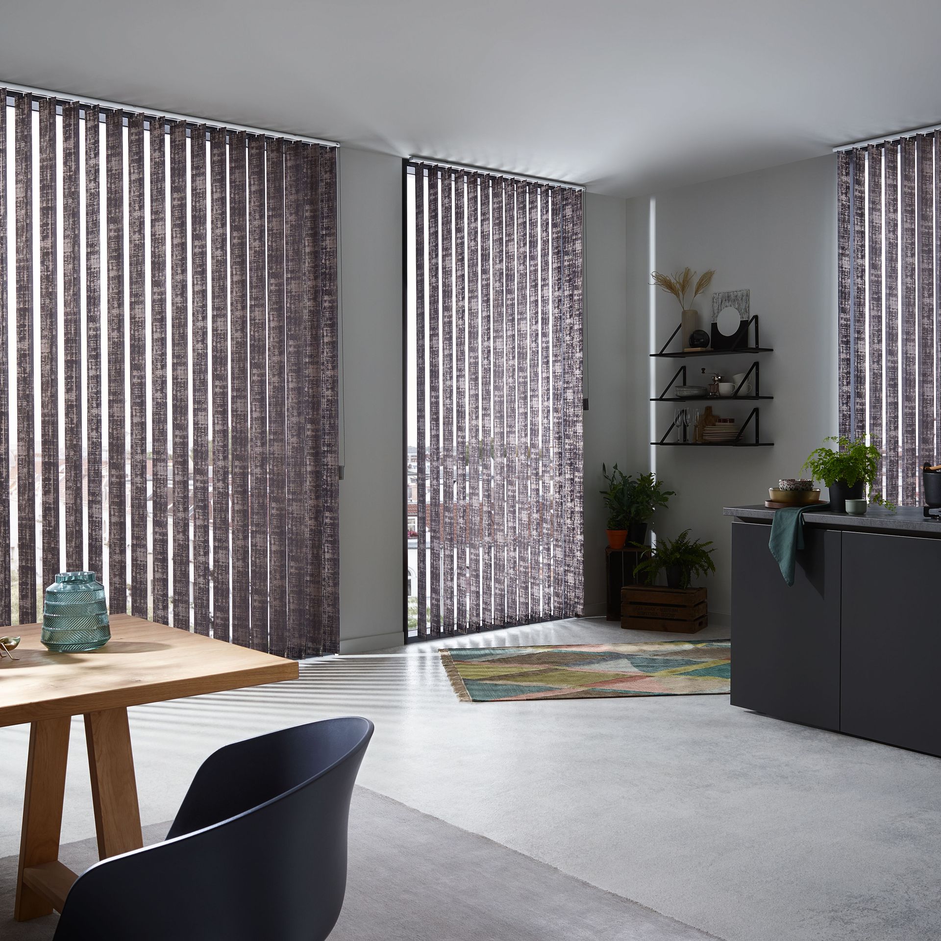 Wie wirkt ein Raum höher? Indem man das Vertikale betont. Diesem einfachen Gesetz folgt die Vertikaljalousie und schafft durch ihre großzügigen Lamellen ein Gefühl von Höhe, Freiheit und Luftigkeit. Sehr reduziertes Design und eine minimalistische Formensprache schaffen ein puristisches Ambiente, das Raum für Funktionalität lässt. Deshalb sind Lamellenvorhänge vor allem im Objektbereich und in der modernen Architektur sehr beliebt. Funktional sorgen sie für maximalen Sonnen- und Hitzeschutz, wobei durch die je nach Sonneneinstrahlung breiteren oder schmäleren Sichtschlitze - je nach Regulierung der Lamellen - für den nötigen Durchblick nach außen gesorgt und umgekehrt die Privatsphäre gesichert ist. Das Streulicht sorgt für ein angenehmes Lichtklima.